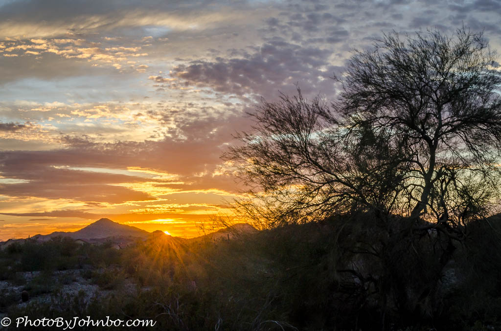 Regular readers are familiar with my occasional sunset photos captured in a small section of desert near our home. A wide spot in the road, a quick pull off the highway and look both ways before crossing the street into the southern end of the White Tank Mountains. Off to my right, the foothills rise into the relatively low mountain range while looking west directly into a setting sun.