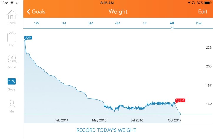 I’d known my physician for over thirty years having met him at a gathering of ham radio operators shortly after moving to Fargo. He and I are both techno-geeks, always looking for the latest and greatest tools. He commented on an app he’d found for his iPhone and how he started his own weight loss journey. He mentioned that people who become less active in their old age, often gain weight sometimes at the rate of a few pounds a year. It isn’t a big sacrifice to cut back a little on the portion size each meal and hold a consistent weight. Cut back a little more and the weight will slowly fall off. He showed me how the free app could be used to track what I eat and how I can set a goal of weight loss per month or week. I downloaded the app and set a goal of losing two pounds a week thinking that would be cool, but knowing that would likely not happen, weight loss programs and human perseverance being known for their past history, especially in my case.