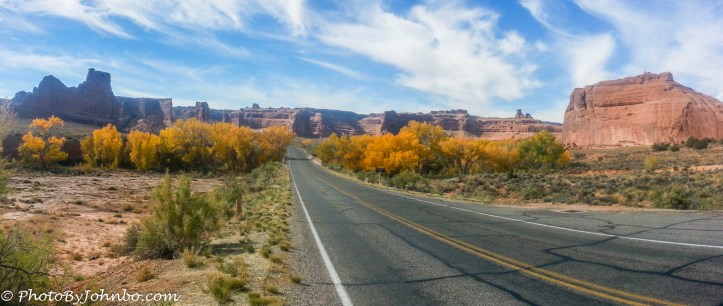 About the photo: If you look carefully underneath the large rock on the right, you’ll see a trail. That’s the hiking trail known as Courthouse Wash. From a quick Google search, I found lots of information about the 5.5 mile (8.8 km) trail. It’s apparently an easy and relatively level hike along a wash and will take 3-4 hours to complete for the average hiker. I didn’t know the trail existed when I took the photo. I was simply struck by the color of the trees and the red rock background.