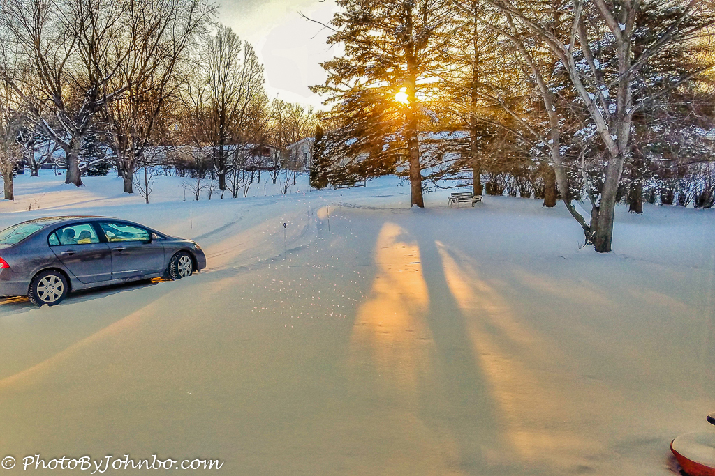 On Christmas Day, we were visiting with family and friends at their home in Horace. As sunset approached, I saw that the sun was casting a golden glow on the snow. It was about 8 below zero F. (-22 C.) at 4 PM, about the time when this photo was captured. Though cold, at least the wind was light. The bonus was that I didn’t have to go outside to capture the image. Their view of the sunset from the living room is as good as it gets.