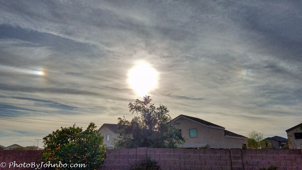 Late in the afternoon on January 14, I stepped outside onto our patio in Buckeye, Arizona and noticed something I’d not seen in Arizona before. A common occurrence, especially in winter in North Dakota, sun dogs were making an appearance here in Arizona. I’m not an expert on the phenomenon, so I can’t say how rare they are in Arizona. I can only relate that I’ve never noticed them here before. I grabbed my Samsung Galaxy S7 and captured the moment.