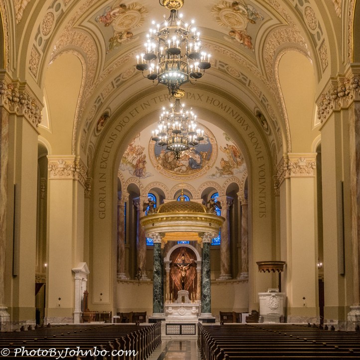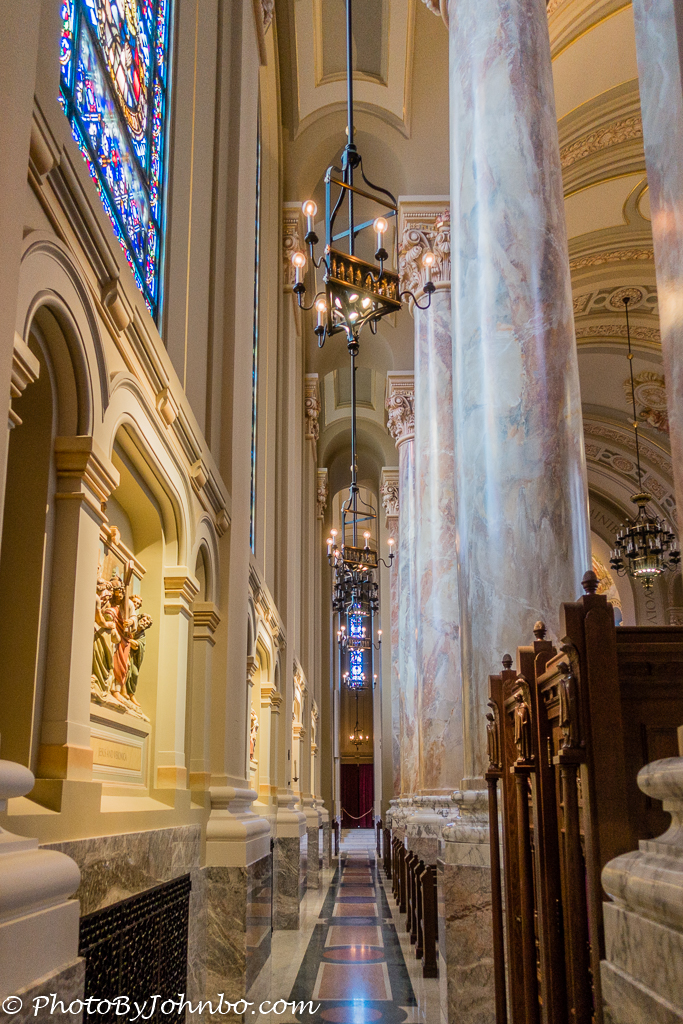 In addition to the central aisle, as in most churches, there are side aisles for entering the pews. Standing at the rear of the church, I was struck by the beauty of the south (left side from the rear) aisle. The ornately carved confessionals tucked between the massive pillars that flank the south wall. On the south wall, the Stations of the Cross are sculpted instead of simply painted. Close-up views of a couple of station sculptures are included in the gallery of images below. According to a timeline on the Cathedral website, the original frosted windows were replaced by stained glass in 1947.