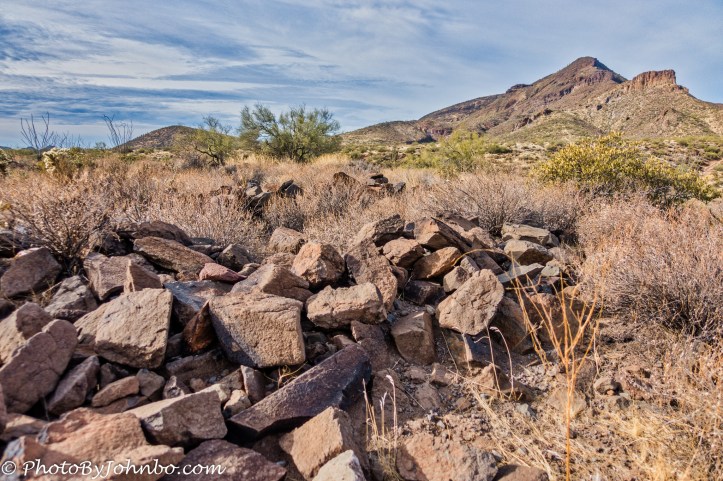 They may look like they are just piles of rocks, but stand back a bit and you can see they are the remnants of rock walls that surrounded living areas. The area in the above photo has been surveyed for artifacts, where the relatively untouched area has pieces of broken pottery and other artifacts just “laying around.” Unfortunately for historians, in the days when this property was a dude ranch, the owners told guests about the Indian souvenirs that could be found in the hills. I’m sure many items of historical import went home or were damaged or destroyed by those souvenir hunters.