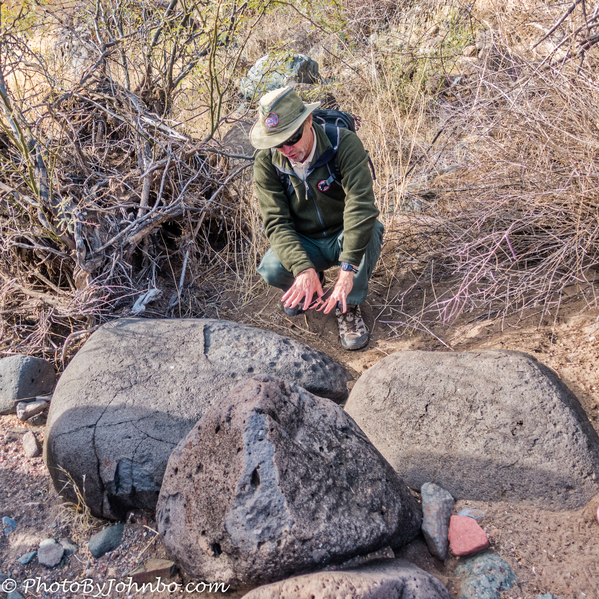 Our hiking club was introduced to Ranger Kevin in previous hikes. Our last hike with Kevin can be found here. Much can be learned by a Ranger-led hike. I recommend checking a location’s website to see if there are hikes where rangers accompany the hikers and describe points of interest along the way. Don’t expect these hikes to be fitness hikes. The goal is education, not calorie burn. In the photo above, Ranger Kevin points out that the unique indents on the rock are actually very early Native American petroglyphs. Funny, I’d have just guessed it was some kid playing with a hammer and a rock. Shows you what I know, and what I learned.