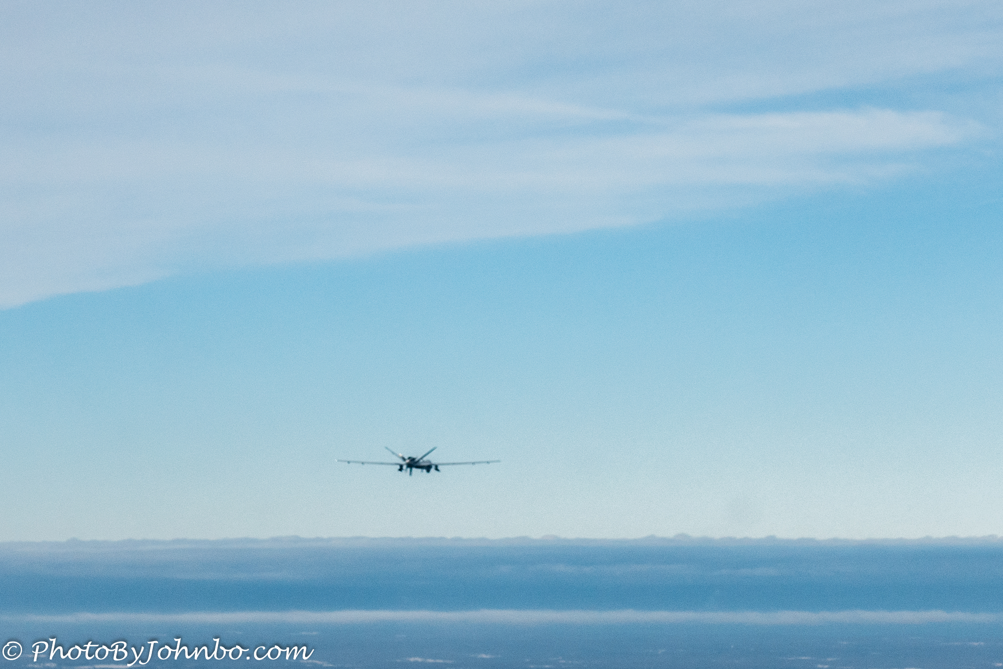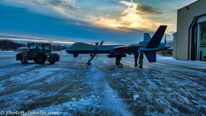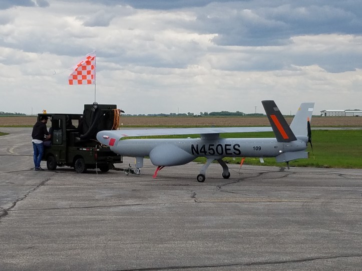 What brought me to Syracuse is an opportunity to be the chase observer for research flights of the MQ-9 Reaper, a much larger UAV than the ones used in North Dakota State University’s ag research project. Compare the size of the men at the rear of this aircraft and the size of the tug and you will note that this UAV is quite a bit larger than the aircraft we use to chase. It’s also lighter, more powerful and more maneuverable than our chase aircraft so the UAV pilots give us a break and take it easy for us during our chase mission.