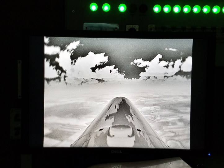 Often in the afternoon, chase escorts another UAV to the restricted area and picks up one returning. Then early evening, one more escort returns the last UAV to its home base. As you can see by the image above, even my little Sony point-and-shoot camera has a better view of the sky than what we saw in the UAV control room in North Dakota. With the high visibility of our Cessna Turbo 182s at Syracuse, the view of the sky is much bigger than even this photo demonstrates.