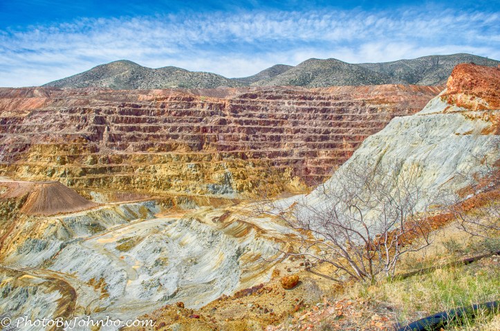 The Lavender Mine, an open-pit dig in Bisbee, Arizona, features patterns of color and of texture. Even though one of the colors is lavender, the mine was named for a gentleman with the surname Lavender, no relation to the colors on display in the mine. Though the materials are “natural”, the patterns were created by the man-made extraction of minerals, the terracing providing a mechanism for easily extracting material from the bottom of the open pit. Though pit mines by their nature have a reputation for being ugly, this mine has a unusually beautiful color scheme.