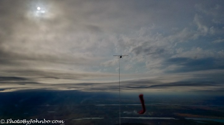 Towing a glider, especially for flights that last upwards of two or more hours takes a lot of skill. The glider doesn’t just obediently follow the aircraft like a trailer. There was an expert pilot on the controls in the tandem seat behind me, and he expertly followed the tow plane even through some bumpy skies. The skies presented some interesting cloud formations on the flight and we even had to skirt a bit to the north to go around a collection of rain showers.