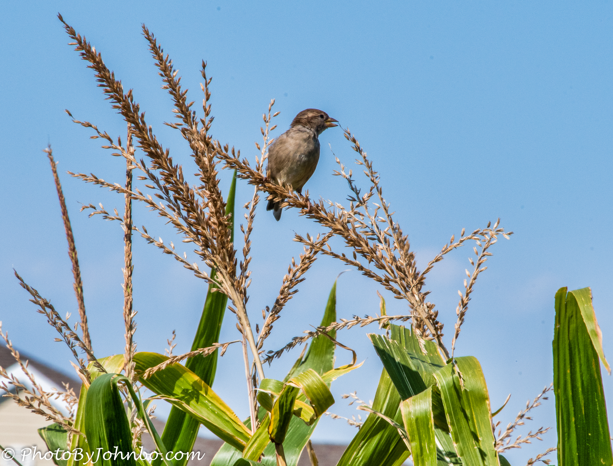 In the petting zoo area, a small garden of corn, wheat, and soybeans features the story of North Dakota agriculture. On a typically windy day, this bird was perched on the top of a corn tassel. The tassel was moving so much with his weight in the wind, I was surprised the bird stayed there as long as it did.