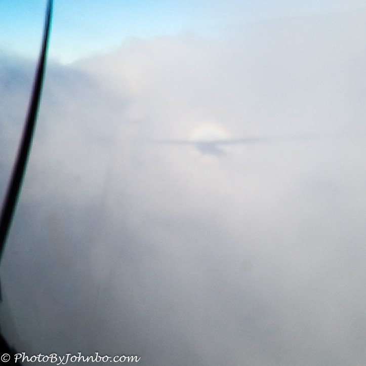 The closer we got to the vertical wall of the cloud bank, the larger our shadow became until a fleeting moment just past this point when we disappeared into the cloud. The rainbow circle didn’t change in size, only the shadow of the aircraft.
