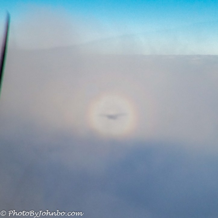 Yesterday I attended a meeting in Bismarck. This trip, I was a passenger and I left the flying duties to Chad, a flight instructor and head of our flight standards department in North Dakota Civil Air Patrol. The sun was behind us, still low in the sky, when we departed Fargo early in the morning aboard a Cessna 182. Reflected on the clouds ahead of us, we saw a circular rainbow. Over my two decades of flying, I’ve seen a few circular rainbows reflected on clouds below us. We were on an instrument flight plan which allowed us to remain at our altitude and fly through any clouds that happened to rise above our flight level. As we approached one of these higher cloud layers, I saw something I’d never seen before. We could clearly see the shadow of our aircraft on the cloud directly in the center of the circle.