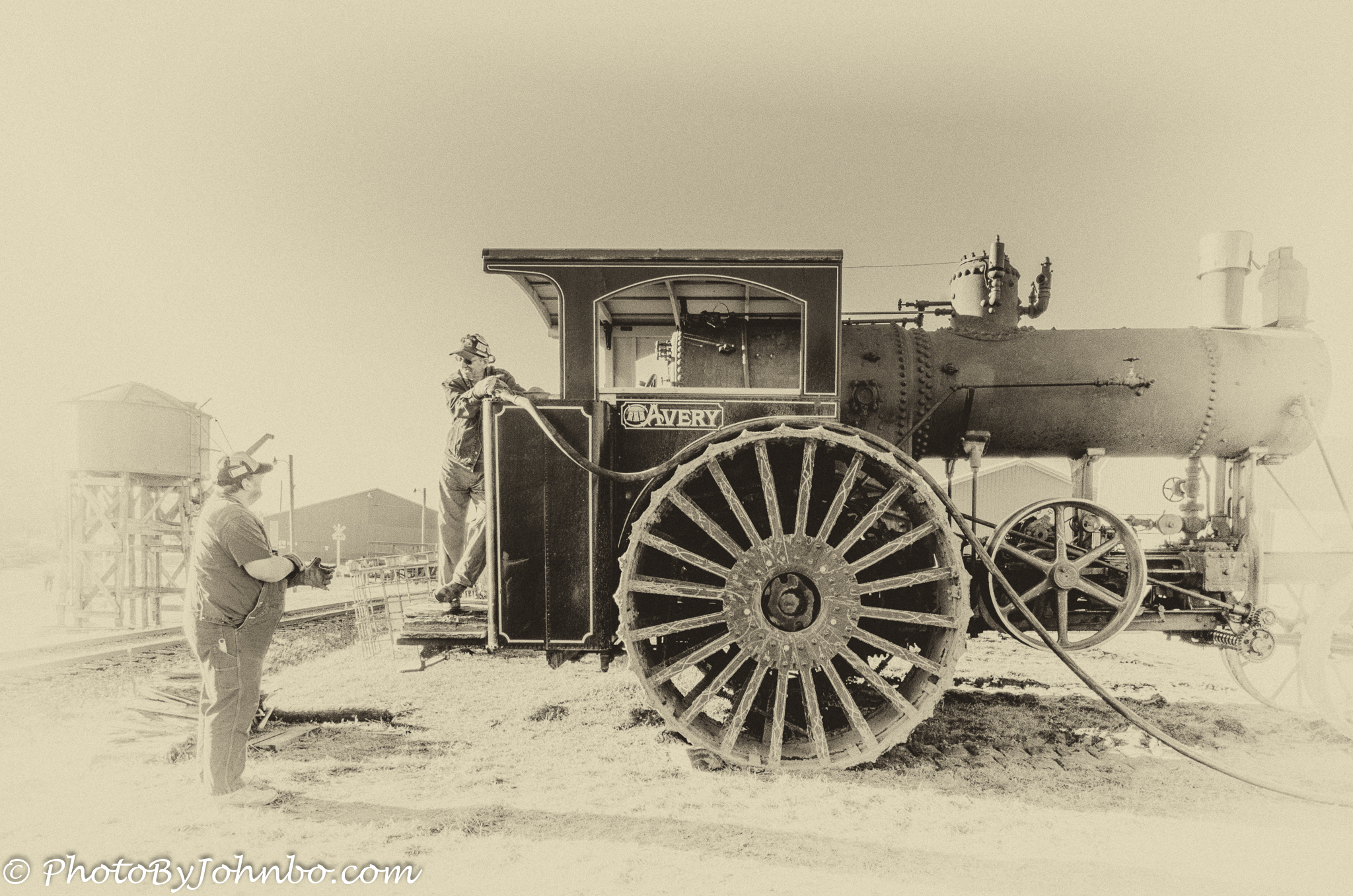 Some of the first tractors of the 20th century, like the example above, were powered by steam. In this image, the water storage tank is being filled. As water escapes into steam, it must be replenished in the boiler. In addition to fuel to power the boiler, a fresh water supply was necessary.