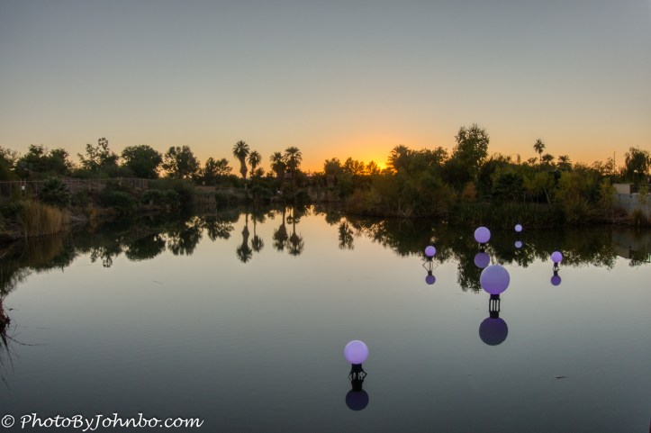 The zoo reopens for patrons of Zoolights at 5:30 PM, shortly after they clear the zoo of their day visitors. Never knowing what to expect of traffic on the I-10 from Buckeye to Phoenix, we opted to leave home at 4 PM. As luck would have it, the trip was uneventful and we arrived in the parking lot at around 4:40 PM. That was plenty early enough to find the parking lot quite empty. Most of the people there were waiting in line at the closed ticket windows or simply wandering around awaiting sunset and the opening of the park. Eventually we wandered to the main gate, tickets printed at home in hand and lined up behind the one family that started the line moments before we did. The view of the impending sunset from the bridge in front of the main gate was a pleasant diversion as we awaited the opening of the gates.
