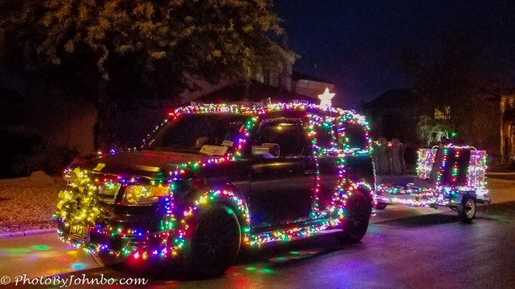 As this is being written, it’s Friday night and we are leaving for Albuquerque early Saturday to spend family time for Christmas next week. We headed out to pick up some last-minute items. As we rounded the corner heading out of our neighborhood, we heard some Christmas music. Parked on the street was an SUV and trailer both decorated to the nines, music emanating from the trailer. I had to stop and capture a quick cellphone image. I used my Samsung S7 cell phone. The rule for Cellpic Sunday is simple, the image must be captured on a mobile device.