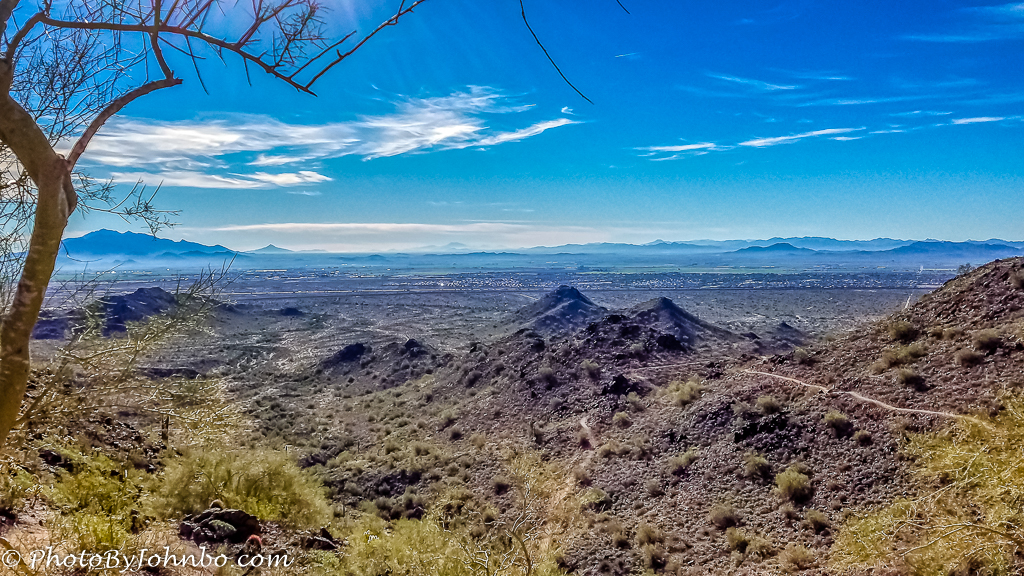 A few weeks ago, I had the pleasure of hiking the Quartz Mine Trail in Skyline Park, just a couple of miles from our winter home. Though I took some photos with my cell phone, after reviewing my collection of images, I preferred this image from one of the high points along the trail that was captured on my Samsung S7 in 2017. The large mountain peaks on the left are the Estrella Mountains and the smaller ones in the distance on the right are the Gila Mountains.
