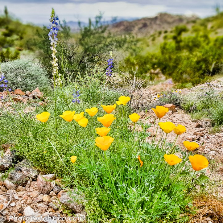 As predicted, the plentiful rains this fall and winter led to an abundance of wildflowers. This stand of golden poppies and lupine is a testament to the abundant moisture received this season… even though the photo is “fake news.” Time for me to fess up… Due to travel schedules and two hikes in February rain cancelled, I didn’t set foot on a trail in February. I saw the wealth of wildflowers in photos captured by my friends on Facebook who did happen to get some hikes in. Indeed, there are still wildflowers out and about and I hope to capture some on this week’s trip to South Mountain. But I digress, what’s fake news about this photo? It was captured in Estrella Park in Goodyear, that’s true. It’s of spring wildflowers. True as well… However it was captured during the last great wildflower season in February 2016. That day we hiked a loop of Toothaker Trail to Butterfield Trail and back to Toothaker.