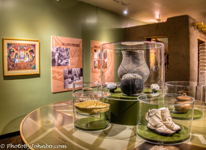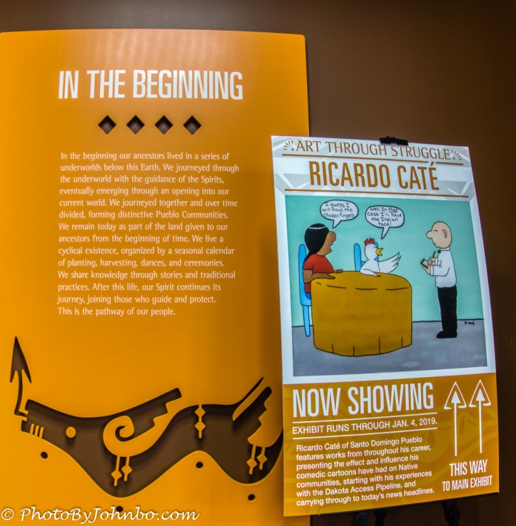 The museum has a continuously rotating exhibition, and a permanent exhibit called, “We Are of This Place: The Pueblo Story.” During our visit, the rotating exhibit, “Art Through Struggle: Ricardo Caté”. Featuring the works of a member of the Santo Domingo Pueblo and an author and cartoonist who’s work called “Without Reservations” is published daily in the Santa Fe New Mexican and the Taos News. His art exhibits the poignant and ironic humor of one who lives in a subculture that is non-dominant. I enjoyed the exhibit of his work so much, I purchased his book, “Without Reservations” from the museum gift shop.