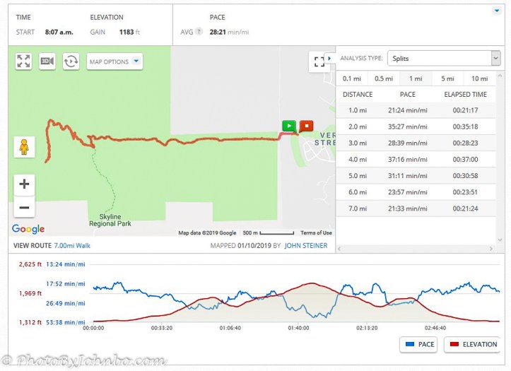 I started using MapMyWalk to track my daily walks and my hikes in August 2013. Since tracking my walks and hikes, my total miles covered is just shy of 1500 miles or roughly an average of 280 miles per year. I’ve slowed down a bit in that the hikes and walks have generally been shorter and less strenuous, but this year, with a larger contingent of hiking leaders who are younger and/or more active than I, it has caused me to renew my effort to take on longer and more difficult hikes. Such was the case in January when with our group, I completed a 7-mile (11.3 km) hike that has an elevation gain of almost 1200 feet (365 m). The view at the top was worth the trip. The opening photo should at least give you an idea of the vista they referenced when they called it the Valley Vista Trail.