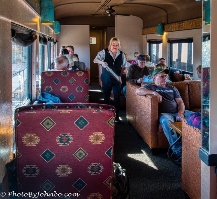 The restored coach cars have plenty of comfortable seating options along with an appetizer table that is open and drinks that can be purchased. There are options for special trains during the holidays but their usual journey is 20 miles (32 km) into the Verde Canyon area where scenic views are plentiful. Once we entered the canyon, I transited to the open-air car behind us to get the photos that I will share with you in the gallery of images that accompanies this post.
