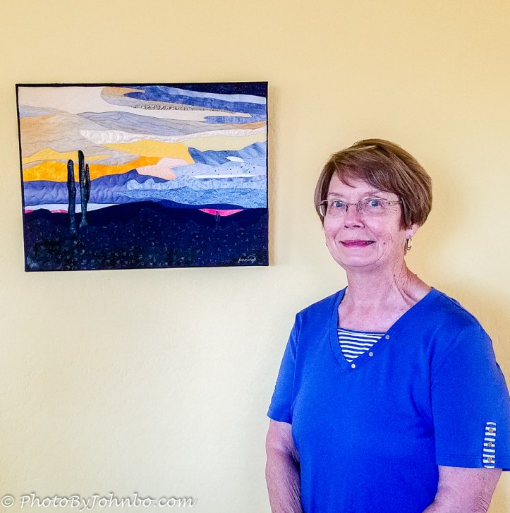 That brings me to this week’s digression, a photo quilt. The opening image is a canvas artwork created by one of our snowbird friends, Joan Jennings. Joan spends her summers near Hope and Merritt, British Columbia, Canada. Besides being an avid hiker and runner, Joan has another hobby, quilting. One of the aspects of this hobby is known as quilt art, a form that combines traditional quilting with new techniques to create artistic objects. In Joan’s case, the quilt is “built” on a canvas backing and the multimedia artwork is framed in a traditional canvas rectangular wooden form. Many pieces of fabric are overlay-ed on the canvas and decorative stitching is applied to give some extra definition to the layer being formed.
