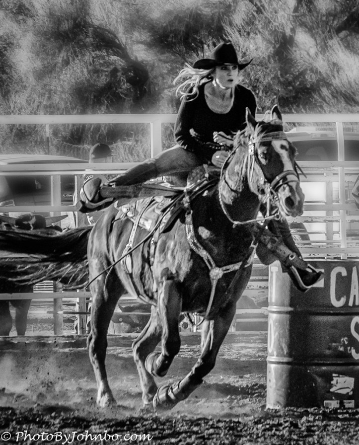 In the original photo, I had the camera in a wide angle setting and captured a lot of extraneous background in an effort to “lead the target” to be sure the high speed of the horse didn’t move the subject out of the frame. Unfortunately, I don’t have a lens with a very low aperture setting so the very busy background of fencing and the cowboy in the background create a real distraction to the subject. In the final image, I did a vertical crop to cut out all of the distractions on the right side of the image. I then used some of the layering and artistic tools in Photoshop Elements create a softer background in an effort to give the viewer a chance to focus more on the subject. Converting the image to black-and-white gave it an even stronger subject focus, I believe.