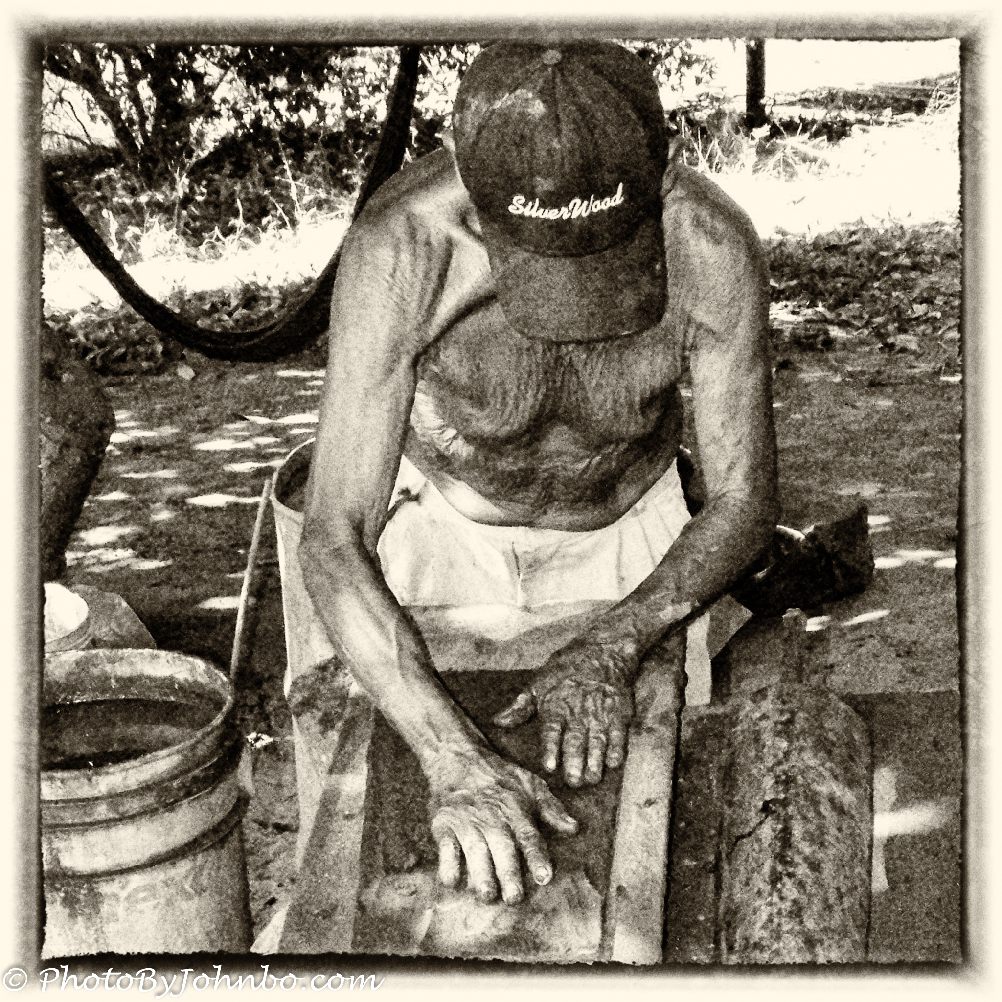 In my youth, I learned darkroom skills using chemical processing for both black and white and color printing. I was a “color snob” always wanting color in my images and on my TVs. Now that I’ve gained some life experience, I’ve discovered that the absence of color is often an artistic statement about texture and mood. This week, Patti Moed suggested that we can share monochrome images, sepia images, single color images and images that feature a spot of color in a black-and-white world. You can check out Patti’s challenge post here. I’ve learned that not all color images work when converted to black-and-white. I occasionally just pull back the saturation on an image to get a feel for whether or not it has promise as a monochrome image. If I like what I see, I reach for Nik’s Silver Efex Pro 2 and start the conversion process in earnest. Every one of the images I share here were tweaked in Lightroom prior to being exported to Silver Efex Pro 2. The opening image features an elderly gentleman creating those curved clay roofing tiles like the one on his left side table. Those hands take on a story of their own when shown in monochrome.