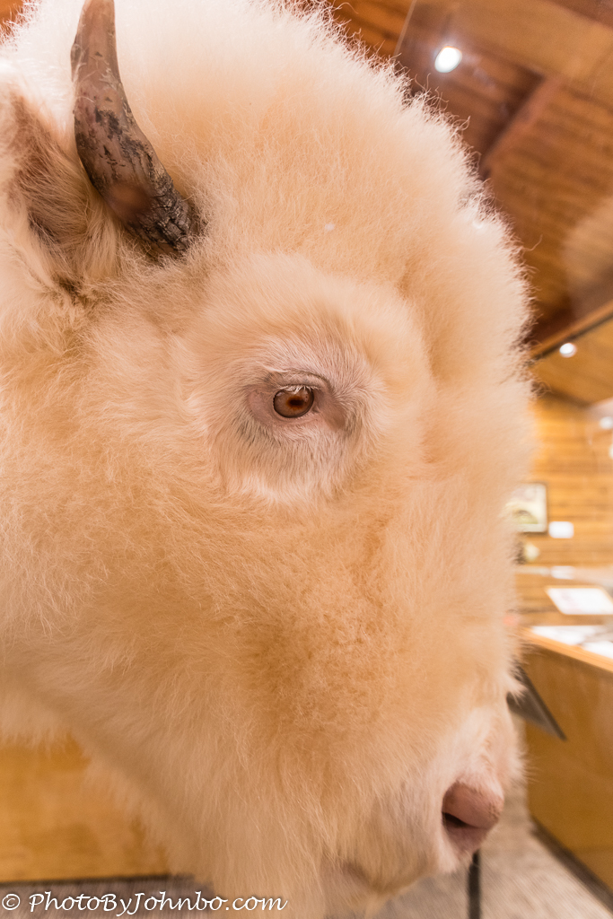 Since 1996, a major attraction in the buffalo herd was White Cloud, a rare albino buffalo who died of old age in 2016, a typical lifespan for an American Buffalo. Her full body mount is on display in the museum. Before her passing, though, White Cloud’s rare genes were passed on to Dakota Miracle, a white bull. A brown buffalo also gave birth to another albino named Dakota Legend. In a news item published online in the Jamestown Sun on June 28, 2019, the National Buffalo Museum announced the passing of Dakota Miracle here. Probably due to a genetic trait of poor vision among albino buffalo, Dakota Miracle stumbled over the edge of a cliff and succumbed to injuries received in the fall. He was 13 years old.