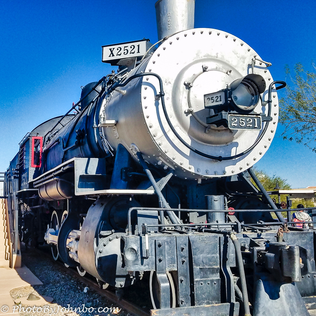 A two and a half hour drive from Buckeye brought us to Yuma for a Civil Air Patrol training activity. Of course, having not been in the area other than passing through to San Diego, we stayed the night and took in the sights of two state parks. On the way between two parks, we happened upon a steam engine, Southern Pacific Locomotive 2521 located at Pivot Point Park. Of course, I had to stop for a few minutes to capture a cell pic or two. A quick Internet search told me much about the engine that was built in 1907 at Philadelphia, PA. This engine burned fuel oil instead of coal, a common fuel for the engines of the western United States. It finished service in Yuma in 1957. On display at the Colorado River State Historic Park for many years, it was moved to Pivot Point Park in 2007. For those who would love more information, a short bio of the engine’s history can be found here.