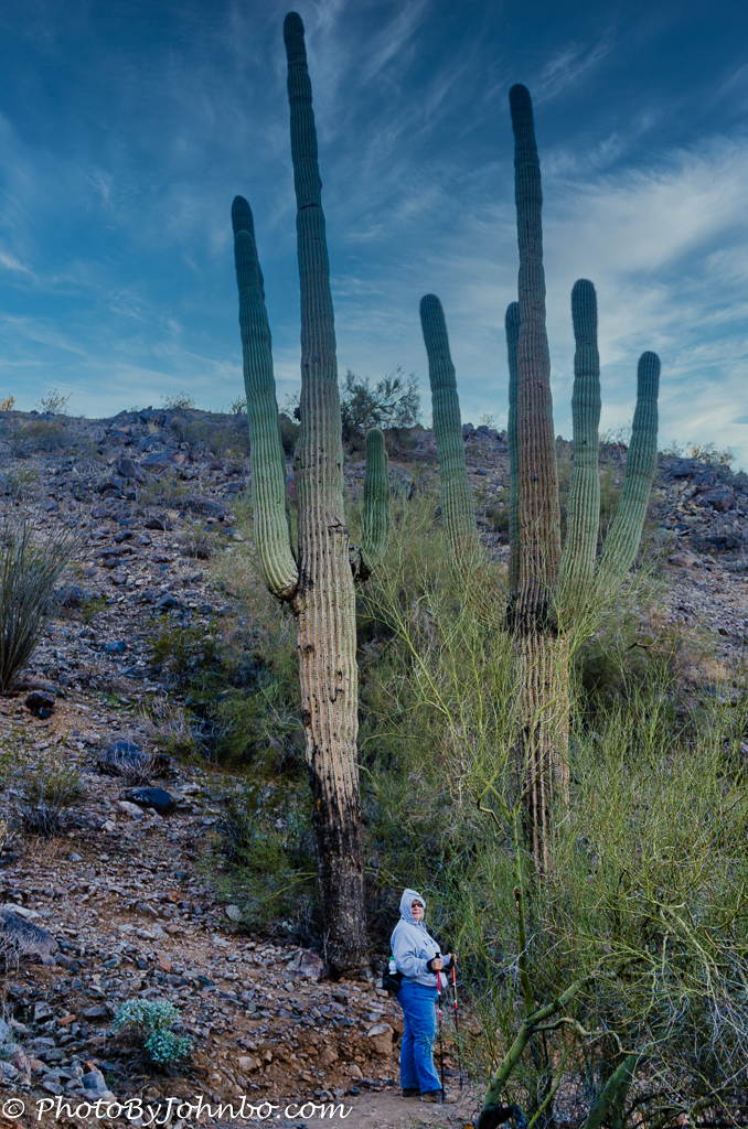 On a cold January day in 2013, we discovered the Rainbow Valley Trail in Estrella Park. One of our favorite trails, Rainbow Valley is on my list to hike annually. Less than a mile from the trailhead, at a sharp bend in the trail stood two giant saguaros. These giants are among the largest we’ve seen. Since then, I’ve learned much about the iconic succulent that lives only in the Sonoran Desert. They live some 200 years or more and don’t start developing those characteristic “arms” until the latter half of their first century of life. Given the size of these two, they certainly must have reached the second century mark by now.