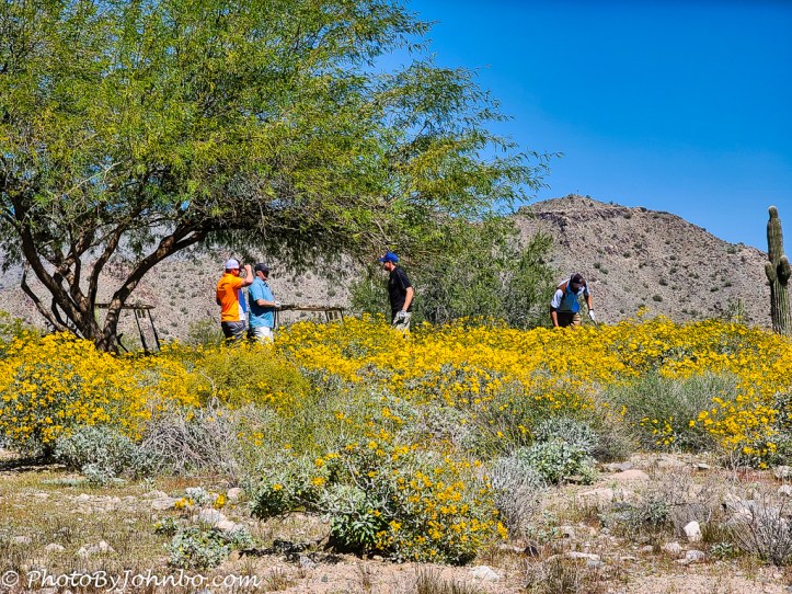 It’s spring in the Arizona desert. At The Founders Course in the Verrado development of Buckeye, golfers are busy throughout the three cooler months. Those who are avid golfers find themselves in the heat of summer out on the course in the early morning when the lows are in the mid- to high-80s. Part of the course is adjacent to the Verrado Trail System. As we walked by on a recent hike, the brittlebush plants were in full bloom with their beautiful daisy-like flowers. On the tee, a foursome was just getting ready to take their shots as I took mine with my cellphone.