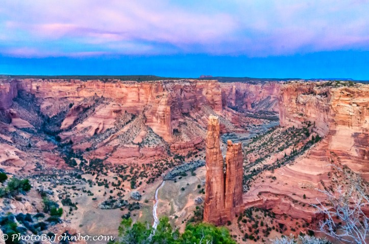 Near the community of Chinle, Arizona, Canyon de Chelly was created by Chinle Creek. The many viewpoints rival the views of the Grand Canyon. On our first and only trip to the area, we did not allow enough time to thoroughly explore all of the scenic stops. The view captured in the photo above is to the east as the sky transitioned into the blue hour just after sunset. The second time around, we will be sure to spend more than a day. In fact, spending a few days in the area will allow us to more thoroughly explore Monument Valley as well, some 98 miles (158 km) from Canyon de Chelly.