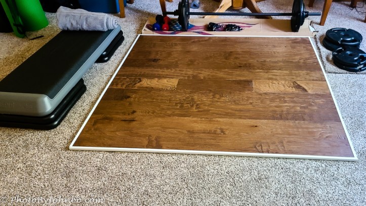 During their closure to members, though, I needed something at home to continue my workouts. Unlike most centers, the owners of Total Balance offered to loan members whatever weight equipment they might wish to use at home until the center reopened. For the cost of a held check that would be shredded upon return of the equipment, I borrowed a bench and a barbell set. I didn’t want to subject the carpet in our spare bedroom/office to the stress of daily exercise for Lynn and myself. I had some boxes of engineered hardwood flooring left over from a remodeling project a few years ago. I put one box of flooring together and that worked for a while, but since I didn’t glue the floor (hoping we wouldn’t have it long), it would slip apart at the joints during exercise. I finally decided it was time for a project.