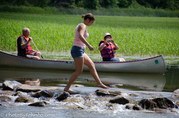 Many eastern Dakota residents eschew the city and head for the lakes in the summer, if only for the weekend. This image was captured from the shore at Lake Itaska State Park, only 105 miles (169 km) from our home. The canoe is in the lake itself but the rocks upon which the girl is walking mark the start of the mighty Mississippi River as it starts its 2348-mile (3779 km) journey toward the Gulf of Mexico.