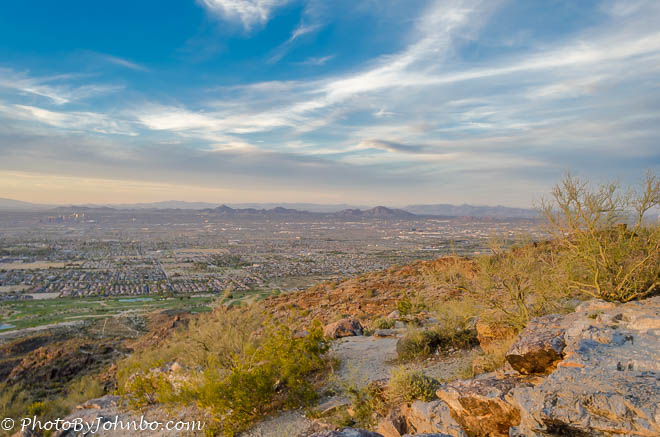 From near the top of South Mountain, at Dobbins Point, the view of the Phoenix metro area is expansive. The metro is ringed by a series of small mountain ranges, the low terrain has come to be known as the Valley of the Sun. With temperatures topping 110 degrees (43 degrees C) in the summer, the name is no misnomer. The Sonoran Desert, in which Phoenix is located, has a northern border that is only about an hour north of the city.