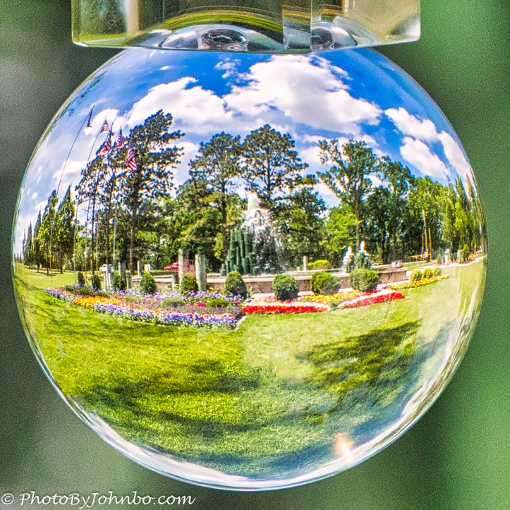 The small diameter “crystal” plastic ball came in a form-fitting case with a black polishing cloth, a transparent tripod mount, and a “table” tripod. Those components are now part of the “kit” that is readily available in my camera bag, and I’ve found I’d rather use a full-size tripod to hold the ball as there never seems to be any tables around the locations I’ve found as subjects. One of my very first subjects is this fountain and garden near the entrance to Lindenwood Park several blocks down a street near our house. In a future post, I’ll gather up some more of these images to share.