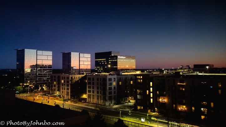 In mid-July, we traveled to Bloomington Minnesota to attend the funeral of a family member. We arrived the day before and checked into a hotel near the Minneapolis airport. Our view from our 9th-floor windows faced to the southwest. I happened to look out the window almost at the conclusion of “blue hour”, that time between sunset and night. I could see the last few moments of twilight reflected in the glass of the taller buildings southwest of our hotel.