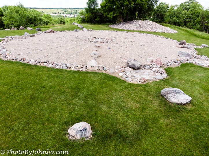 An electrical utility line traverses the park near the medicine wheel. One of the poles was adopted to be a solar reference to the beginning of each season at local noon. That’s the scale in rocks laid out and extending away from the base of the pole. On the day of our trip, by the time we got to Valley City, (about an hour drive from our home in Fargo), an overcast sky moved in and obscured the shadow that would help in understanding the purpose of the pole.