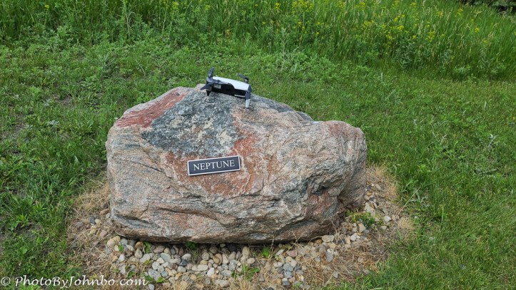 The most interesting feature in the park to me is the scale representation of our solar system. A trail, about a third of a mile (0.5 km), winds through the park. It’s an improved trail (ok, it’s a sidewalk most of the way.) The drone shot above focuses on the first four planets nearest the sun at the center of the wheel. Just below the sun is Mercury, the next larger rock is Venus, then Earth, and that boulder in the lower right is Mars. There is logic to the placement of each planet. This solar system model is built to scale with one foot (0.3 m) equalling three million miles (4.828 million km). The distance between the sun and that Mars rock is 47.2 feet (14.39 m) from the center of the wheel representing the planet’s distance of 141.6 million miles (227.9 million km) from the sun.