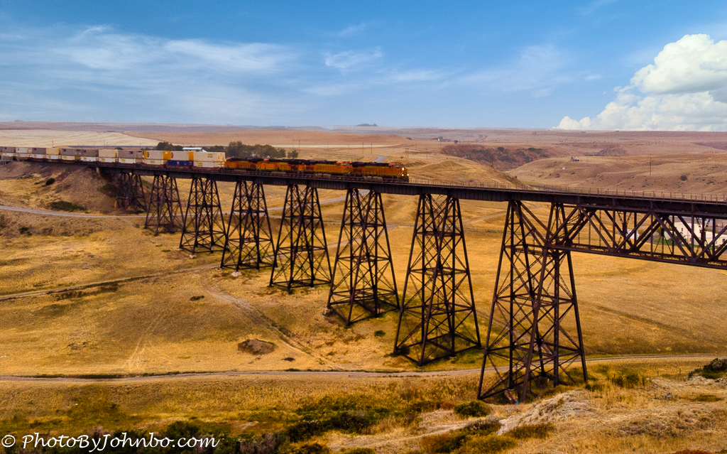 The next morning, I launched my drone and flew it over the valley to capture some images of the bridge. I’d barely launched the drone when we heard a train whistle. I couldn’t believe my luck. The track, owned by Burlington-Northern is used about 40 times a day, including two Amtrak Empire Builder runs. As you can see by the opening photo, it was a freight train that I captured this morning.
