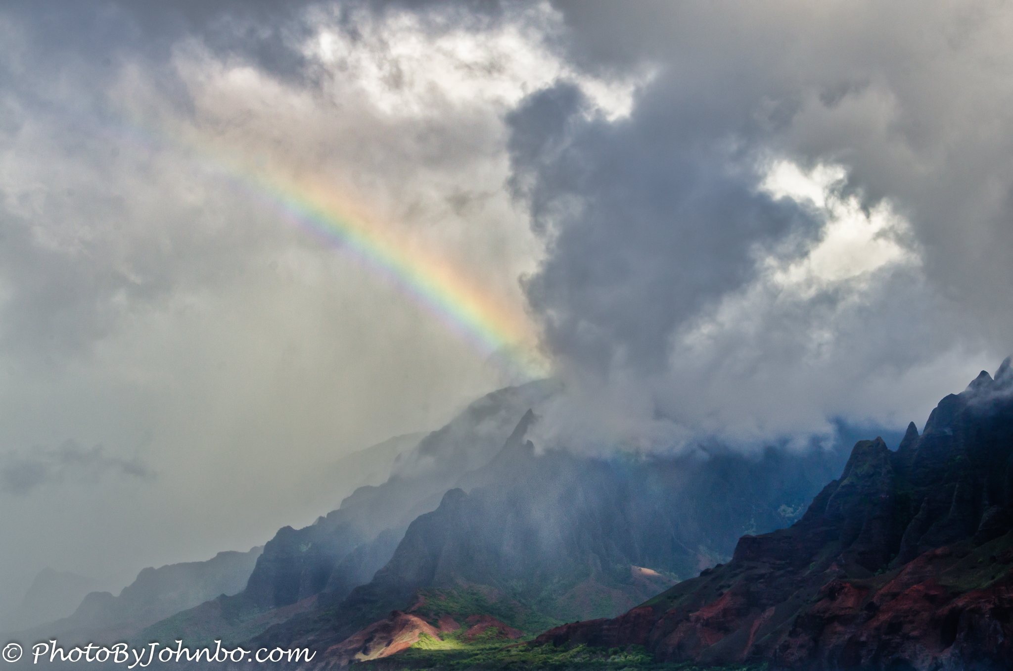On the northwest coast of the Hawaiian island of Kauai, an area of significant and rugged beauty is known as the Na Pali Coast. On a dinner cruise, we approached the coastline in the late afternoon. A small rain squall had just passed ahead of us and proceeded directly toward the island. As we got closer, the squall had moved on leaving low clouds and fog in its wake. The late afternoon sun shining through the mist brought a rainbow forth for the pleasure of the many photographers on the ship.