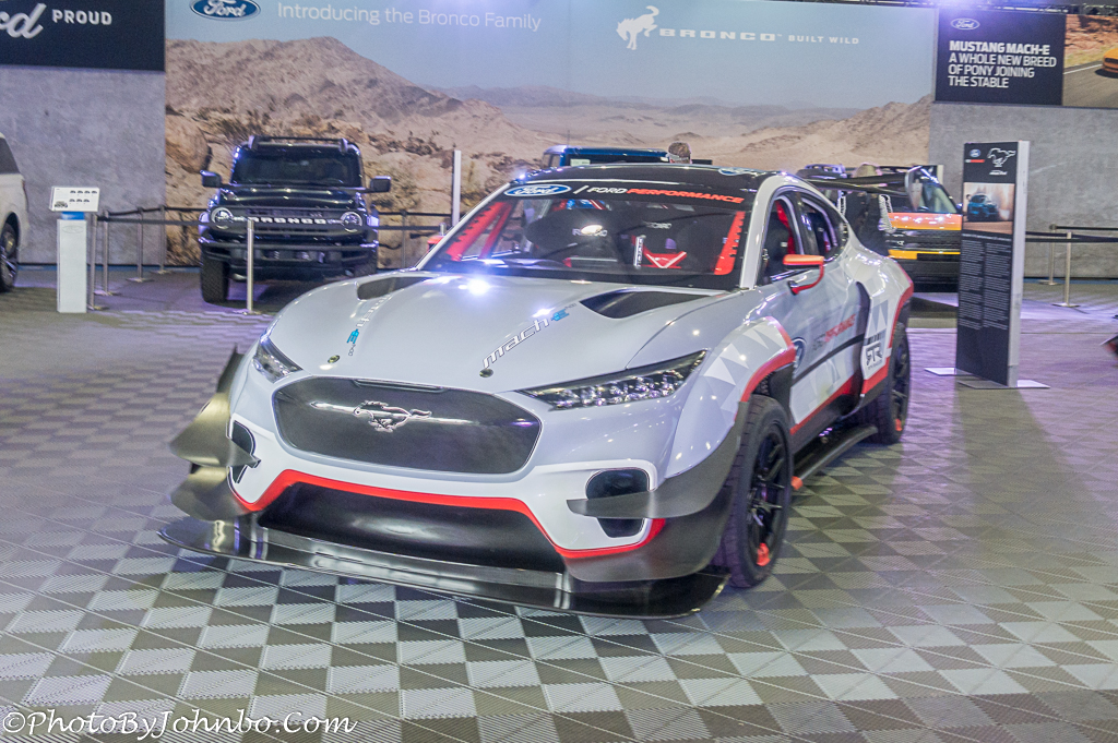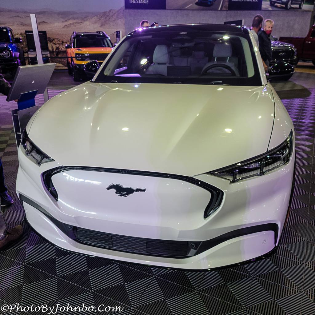 Ford Motor Company has the first exhibit space one sees when walking in the main entrance, and the opening image, my dear readers, threw me for a loop. It was the first open hood I saw among the new Fords on display. This is the under-hood view of the Cobra Jet 1400, an all-electric drag racing concept car. It is a screamer, as I would find out later when watching some YouTube videos. The 1400 HP electric system holds its own against conventional dragsters in its class, and it would appear that driver reaction time is as important a determination of a winning race as is the performance characteristics of the vehicle.