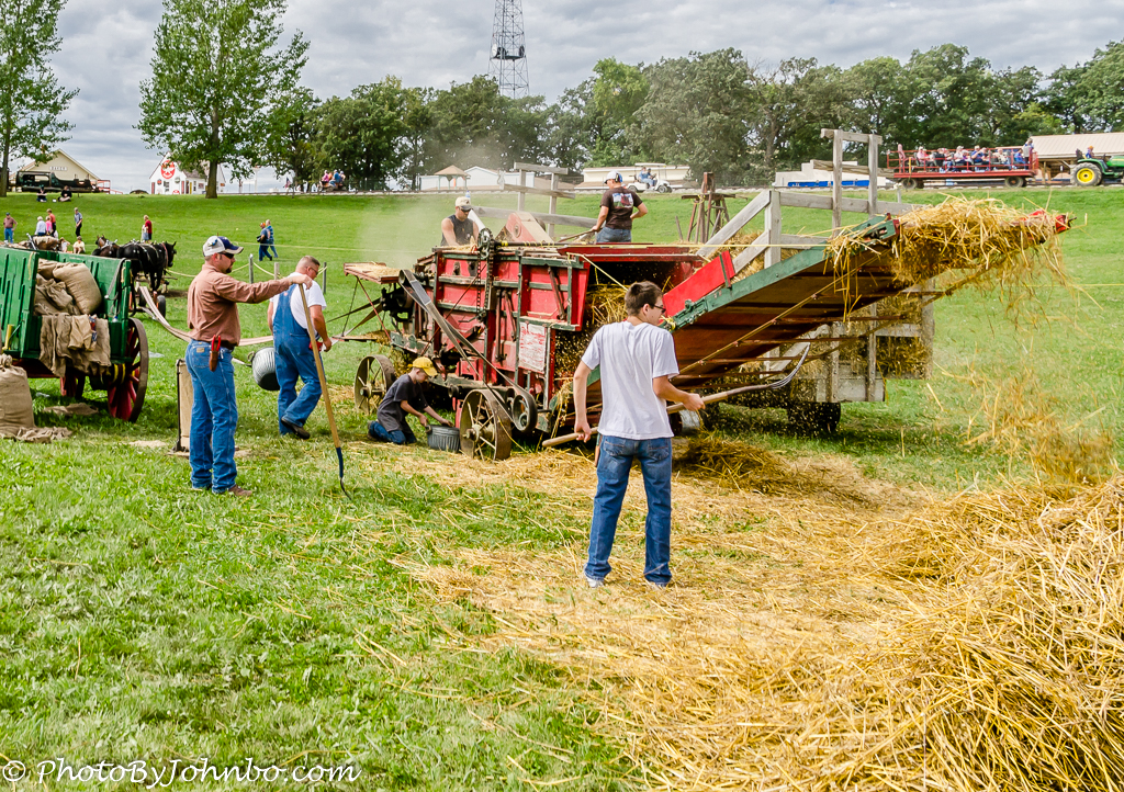 Much more sophisticated equipment now replaces the threshing machine, but as late as the early 20th century, these giant machines were still in use in fields throughout the United States. A lot of mystic surrounds the process and annual threshing events are held to honor the labor-saving device. The image above was captured in 2016 at the Minnesota Steam Threshers Reunion, a Labor Day Weekend gathering that celebrates the machine. The specific machine above was actually powered by horses turning a large belt that operated the mechanics. You can see the belt behind the machine on the left. The green wagon blocks a view of the turnstile where draft animals provide the power to run the thresher.