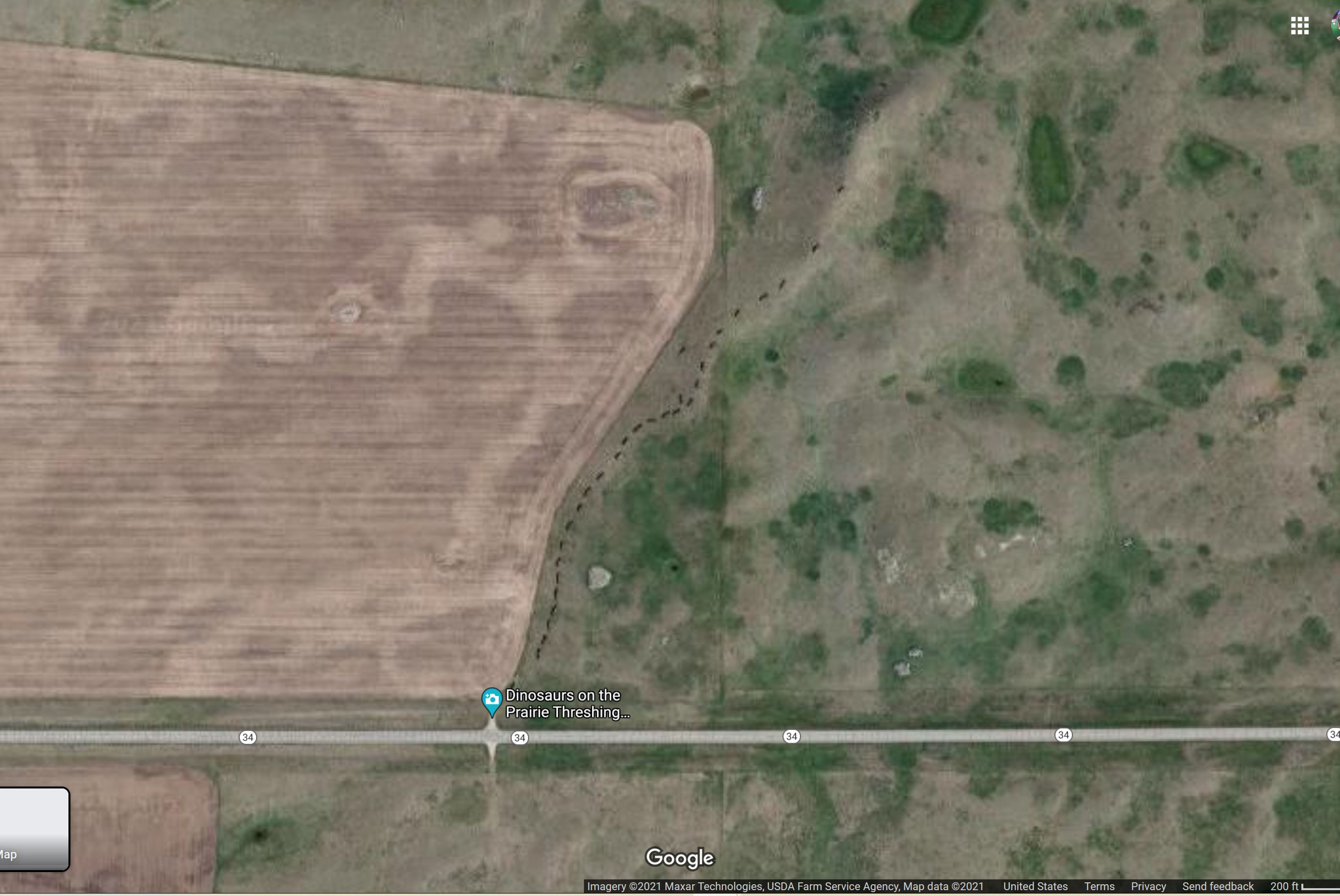 Another view from the drone shows also how little parking is available at the site. There is a field driveway that crosses the ditch next to the road, and if it’s not muddy, a car can park on the drive for the short while it takes to maybe walk to the top of the hill and view the collection. Remember, though, you are on private property so please respect the property for the owners who have left this collection for travelers to enjoy.