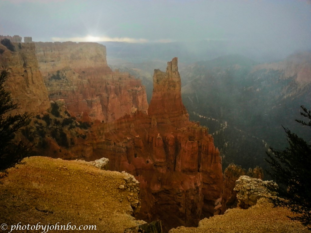 In late October that year, we stopped at Bryce Canyon expecting to view the park. Regular readers may recall that we arrived in the area late one afternoon in fog and rain, and by the next morning, when we left our hotel to capture sunrise images in the park, we found a world of white with at least a foot of snow covering our car. Bryce only had two viewpoints open that day, but the snow-covered peaks were spectacular.