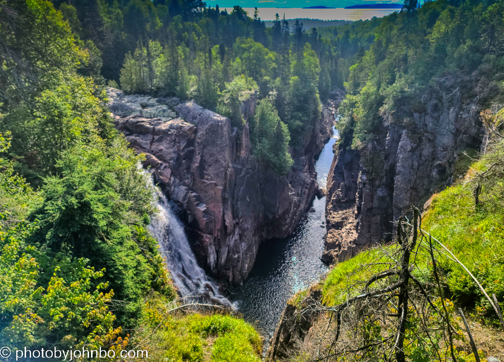 A boardwalk led me a short distance to a large overlook and viewing area. Below me lay a waterfall and a steep gorge. Looking directly south, I could just see Lake Superior in the distance. I didn’t have either of my “good” cameras with me, and I wasn’t going to hike back to the car to grab one. “This short rest stop would be a good Cellpic Sunday image,” I thought.