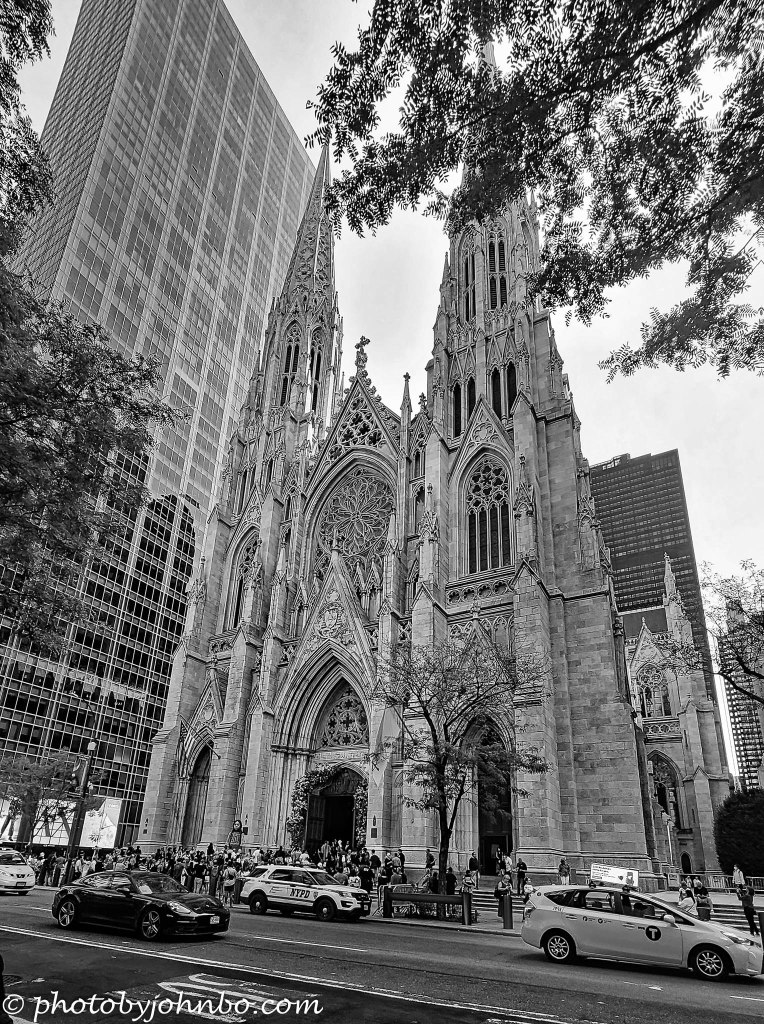 About the photo: How do you capture an iconic symbol in a photograph and not make it look like every other tourist photo you’ve ever seen? In similar situations, I’ve opted for panoramic photographs stitched together and looking straight on to be sure to capture the true height of those beautiful spires. This time, I tried a single vertical composition but I purposely tilted my Samsung S20U to be sure I captured the entire facade. I included the skyscraper in the background to emphasize the difference between this historic church and modern New York City. This image went from Lightroom Classic to DxO’s Silver Efex 2 for conversion to black-and-white. Click on the image to view it in 2K HD on my Flickr site.