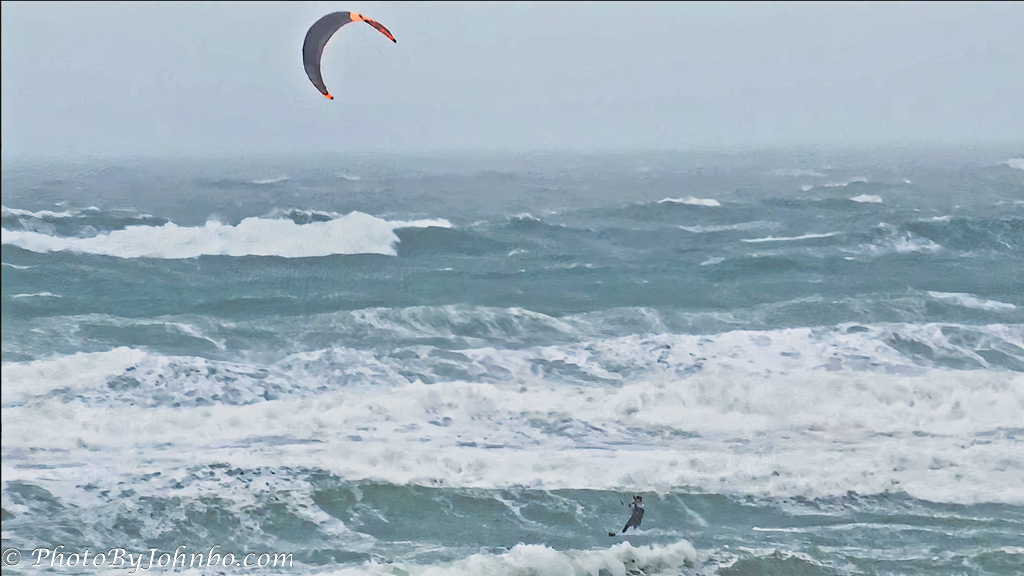 Two days during our two-week January stay at Emerald Isle were interrupted by official storm warnings. As predicted wind speeds neared gale force and the possibility of strong rainfall increased, the property owner advised us to secure the storm shutters in front of the large ocean-facing patio door. While the winds raged and before light sprinkles turned into a steady rain, I ventured out on the third-floor balcony to secure the shutters. Observing the turbulent ocean, I noticed an unexpected sight: a kite-surfer utilizing the wind’s power to navigate the waves with a kite-surfing wing. This intrepid individual rode back and forth along the surging waves, harnessing the wind’s energy in a display of skillful defiance against the elements.