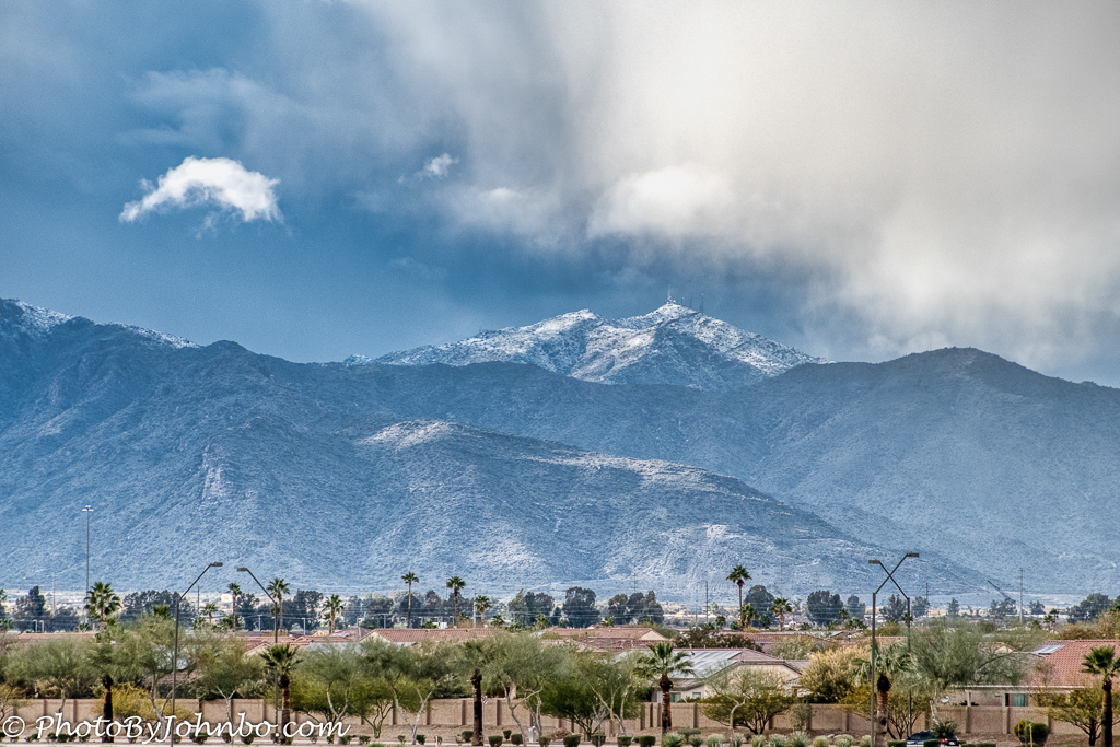 For my response, I’ll start with some natural scenes and events, then dive into the unusual or coincidental. First up, Lynn and I spent over a dozen winters in Buckeye, Arizona. Just a few miles from our house, the White Tank Mountains were an ever-present joy to see. The mountains, on the western edge of the Phoenix metro, rise to over 4,000 feet (1,219 m), towering over the lower metro areas. Given the warm climate in the Sonoran Desert around Phoenix, we never saw any snow on the mountains — until February 22, 2019. Snow fell on the White Tanks, and even in lower parts of the metro, such as Scottsdale and Peoria, at an elevation of 1,000 feet (300 m). The record-breaking cold air was designated a Major Winter Storm by the National Weather Service. For us, it brought a unique view of the White Tank Mountains we’d never seen before or since.
