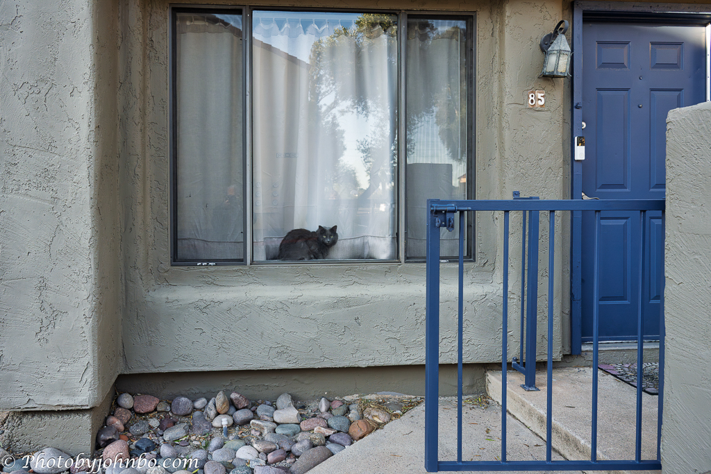 We’ve just arrived in Tucson for the winter, so I took the opportunity to explore the neighborhood—twice, in fact—to see what kinds of photo opportunities might present themselves. Just steps from our apartment, we passed a neighbor’s unit, and I couldn’t shake the feeling we were being watched. I mean the feline no ill will, but looking at those wide eyes, I was reminded of the old adage: “Curiosity killed the cat.”