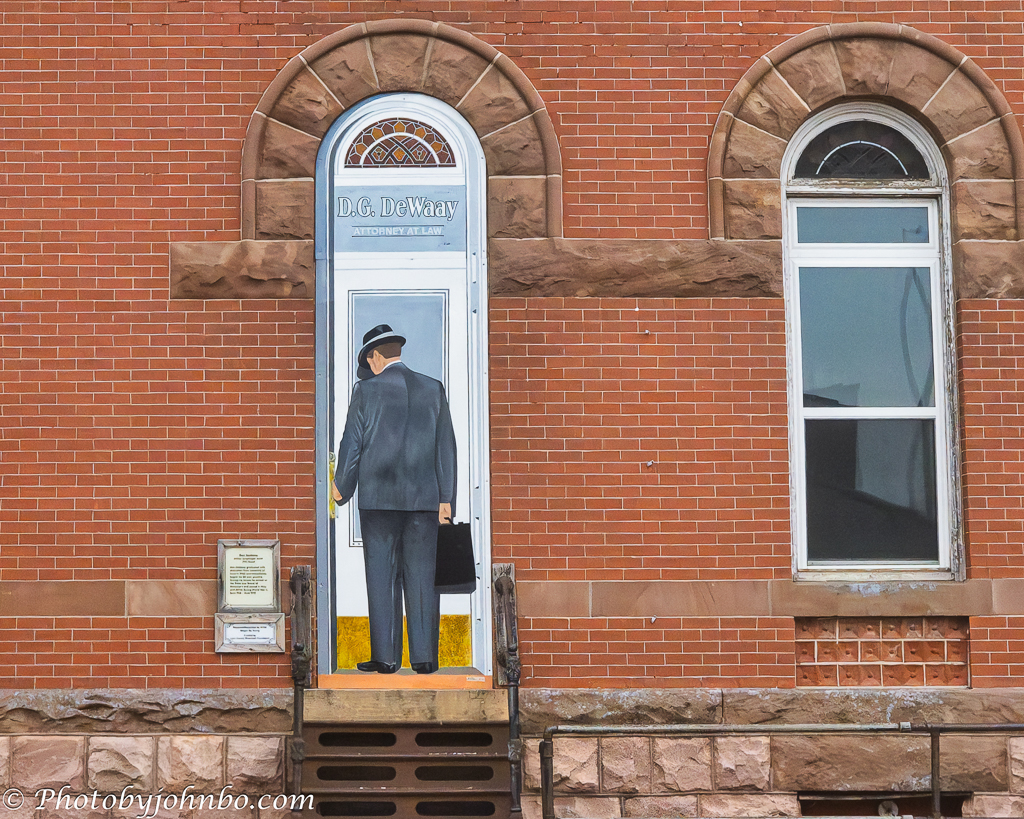 We discovered a growing series of outdoor murals that transform the town’s brick facades into storytelling canvases. A local public art initiative celebrates community heritage through portraiture, symbolism, and historical detail. The murals depict figures who have shaped civic life in Rock Rapids; some names are familiar to us, while others, such as the attorney depicted in this photo, are new. This post begins with the mural featuring attorney D. G. DeWaay, whose decades of legal service and civic leadership earned him a permanent place on the town’s visual timeline.